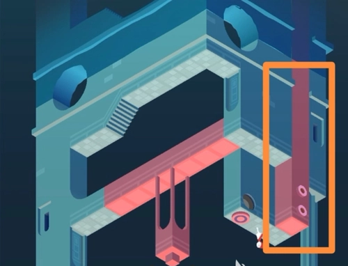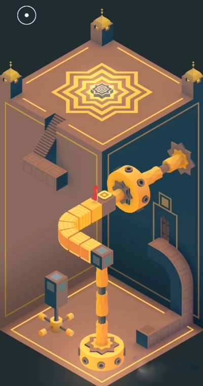 场景三的操作步骤是:先把建筑调整成下图所示的模样,然后让小人进入传送门,小人会从中间那一层的门出来;之后再次旋转建筑,拼接成楼梯,方便小人向上攀爬;最后通过三次旋转操作,就能引导小人进入最终的门了!场景四里的凸弧形墙和凹弧形墙都能移动,先借助凸墙移动到前侧的灰色按钮位置,再移动到另一个按钮处,图腾就会出现,这一章也就结束了。