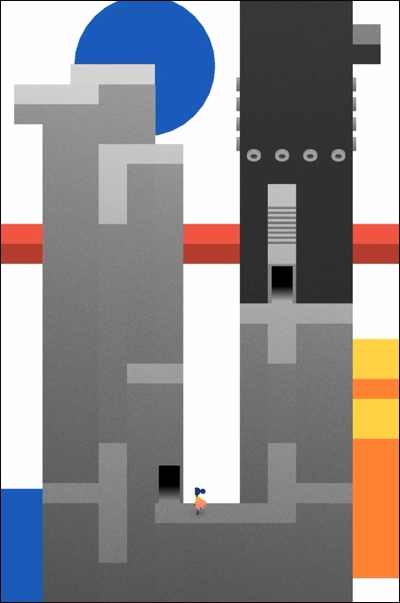 进入第一个场景后,玩家首先需要移动红色建筑使其充当桥梁,操控小人通过后,再次移动该建筑,小人就能抵达门的位置。第二个场景的操作步骤是:先上楼梯转动轴承,接着移动建筑让小人登上固定建筑,重复上述操作并点击按钮后场景会发生变化,此时玩家需要再次转动轴承,让小人能够按下另一个按钮,之后便可通过传送门直接到达终点门所在之处。