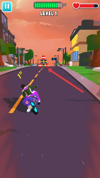 2、玩家进入游戏后,需操控摩托车在城市道路上行驶,通过左右滑动屏幕来调整摩托车的方向,完成对前方其他摩托车手的超越。