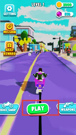 1、玩家完成游戏操作后,点击进入游戏主界面,再点击绿色的PLAY按钮,即可进入摩托车特技冲刺的游戏关卡。