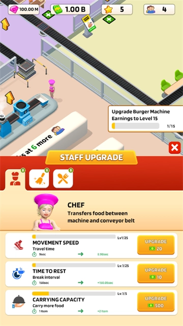 1、解锁新内容:玩家能够借助赚取硬币来解锁新的食谱并升级设备,以此提升餐厅的收入。