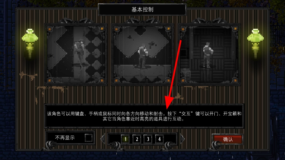 2、基础操控可借助键盘、手柄或鼠标实现多方向的移动与射击,按下交互键,还能与靠近时会高亮显示的门、宝箱等道具进行互动,熟悉操作后点击确认即可。