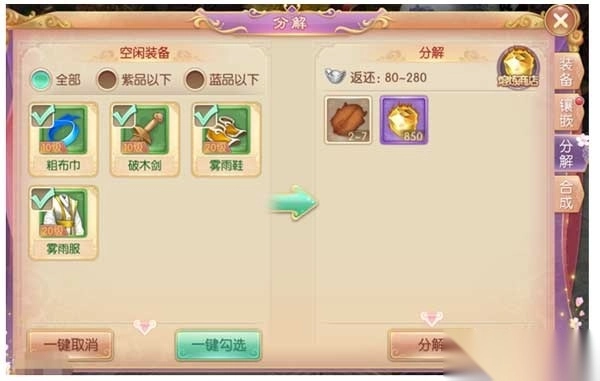 多余的装备,玩家可以在分解界面进行分解,可以返还一定的银两及材料和熔炼值。