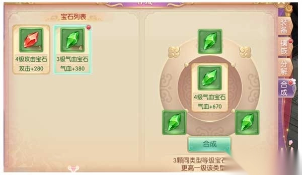 如:3颗3级气血宝石可合成为一颗4级气血宝石。