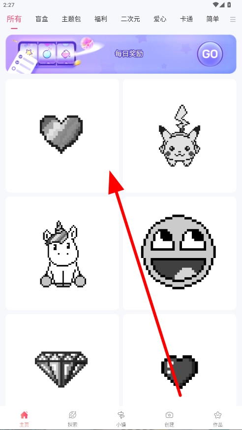 1、首先在图案选择界面,有多种像素风格的图案可供挑选,选中心仪的图案,即可开启填色创作之旅,为后续填色做好准备。