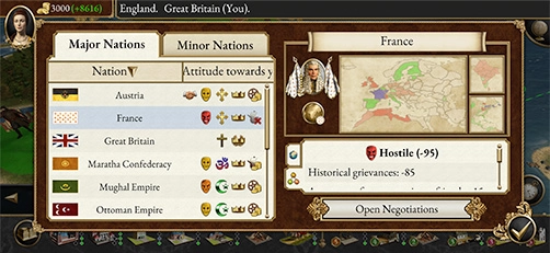 玩家能够挑选不同国家的领导者身份来进行游戏,每个国家都具备独有的长处与特色。在游戏里,存在多种类型的兵种可以让玩家招募和训练,像步兵、骑兵、炮兵、海军之类的都包含在内,玩家还能够对各类科技展开研究,以此增强国家的综合实力以及军队的作战能力。