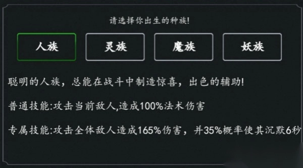 人族:中后期选手,前期会比较弱势。当有一定装备后,人族在挑战boss,有独特妙处。种族技能为沉默效果,谁用谁知道,特别中后期,大部分挑战都在比拼谁能更高效的进行技能释放。