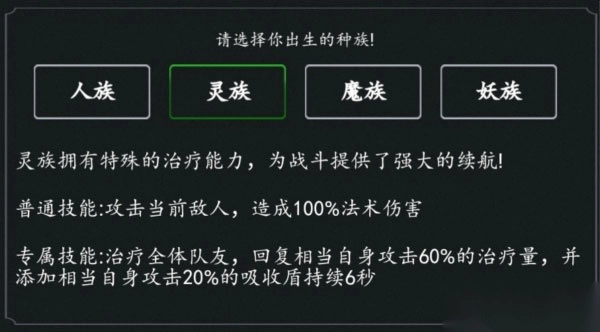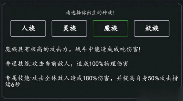 玩家可以在游戏创建不同的角色,可以选择人族、灵族、魔族、妖族新建角色