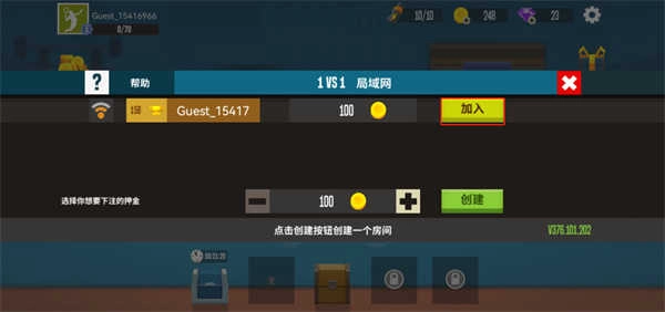 6、前面的设置都完成后,另一位玩家只需点击1v1模式,此时游戏里会生成一个房间,点击“加入”就能开始游玩了。