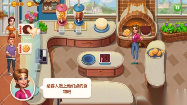 4、接下来便正式开启游戏流程,玩家要依据顾客的订单,提供对应的食物,例如蛋糕。