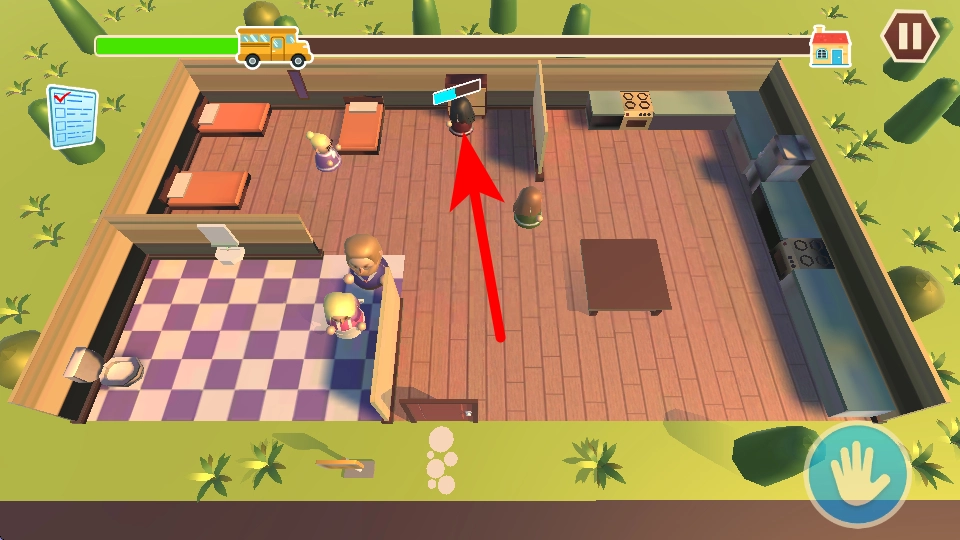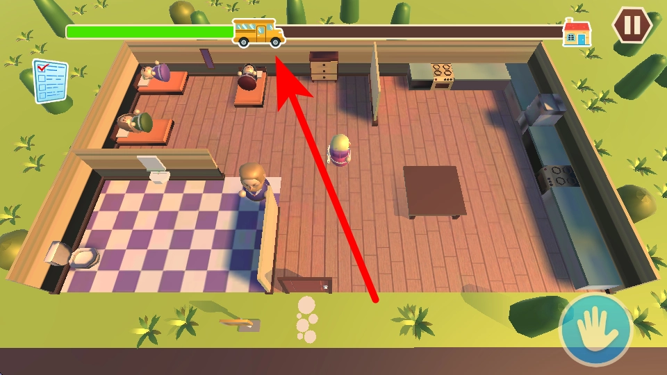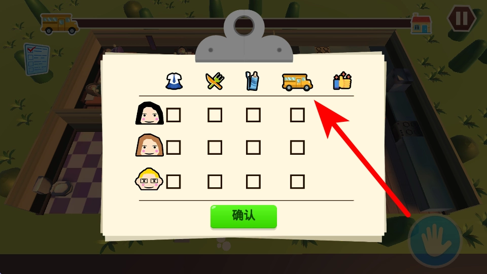 2、进入第一关的游戏场景后,顶部有一条进度条,进度条上有校车图标,要关注与校车相关的进度来推进游戏。