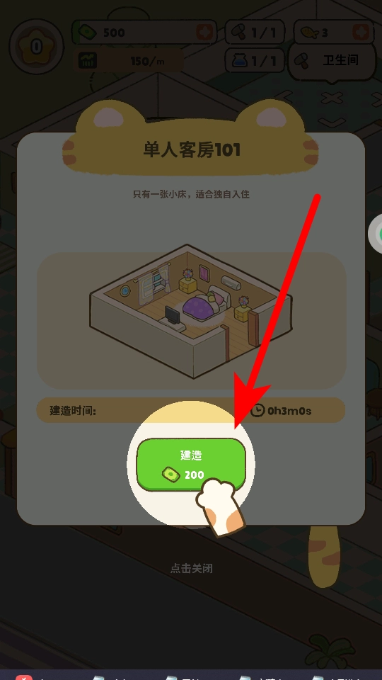 1、对于单人客房,点击建造按钮,花费两百货币,需要建造时间,就能建成该客房。