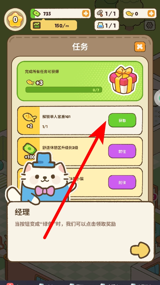 3、在任务界面,完成解锁单人客房101等任务后,当获取按钮变为绿色,点击它就能领取对应的奖励。