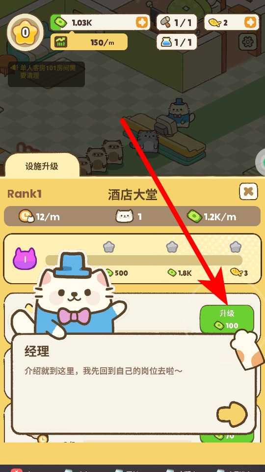 4、在酒店大堂的设施升级界面,看到升级按钮,花费一百货币点击它,能提升酒店大堂的等级,助力酒店发展。
