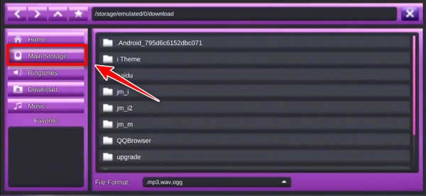 7、点击这里切换到手机根目录,然后找到你之前到手机里的音乐位置