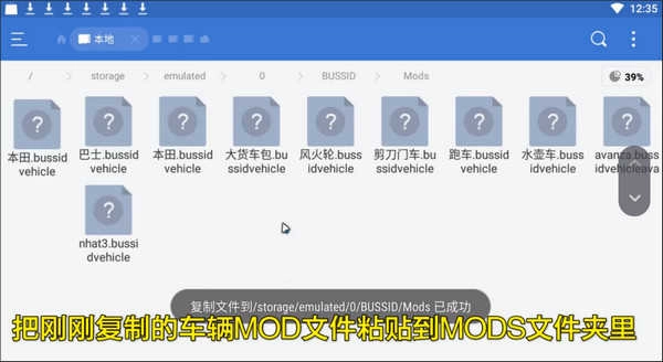 2、操作完成后,打开手机的文件管理应用,进入Android目录找到dats文件夹。若文件来自QQ群,可依次点击tencent、QQfile,长按对应的mod文件,将其移动到BUSSID文件夹内。
