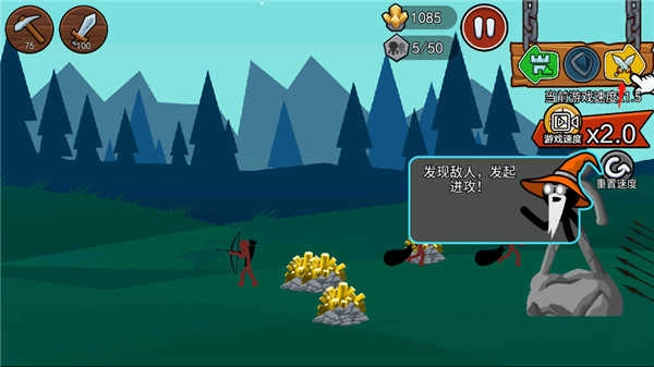 2、你可以指挥军队组成编队,也能单独操控每个单位,每一个火柴人都由你掌控。你需要建造作战单位、开采黄金资源,还能学习剑术、枪矛等战斗技能,训练弓箭手、法师乃至巨人等不同兵种。最终目标是摧毁敌人的雕像,将所有领土收入囊中。