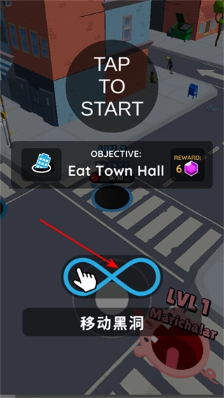 2、开始进行操作,点击TAP TO START或提示区域,操控黑洞进行吞噬操作。