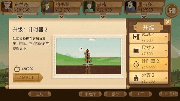 探矿者找到油井后,我们能在它附近放置油井设备,这套设备需要350元。不过事情还没结束,我们得点击设备向下钻井,以此确定更精准的位置。要记住,钻井并非免费,钻得越深,花费就越高。因此刚开始的时候,我们可以分小段距离来钻井,这样能降低不必要的资金消耗。