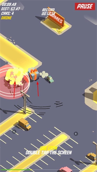 1、操控车辆在道路上行驶,要注意躲避其他车辆,避免发生碰撞,同时可以利用场景中的元素,双击屏幕可使用道具,对周围车辆等造成影响。