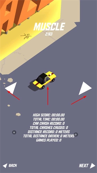 2、游戏会记录行驶的距离碰撞次数等数据,还有记录显示最佳成绩,玩家需要尽可能行驶更远的距离,减少碰撞,挑战更高的记录。