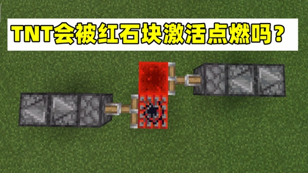 这里有一个很简易的“BUD”装置,两个装置都接了一个“粘性活塞”。这两个“粘性活塞”分别推动和拉动着“TNT”与“红石块”移动。当两个“粘性活塞”同时推出时,从截图中能清晰地看到,“红石块”和“TNT”是完全挨在一起的。那么,在这个时候,“TNT”会被“红石块”“点燃”并激活吗?