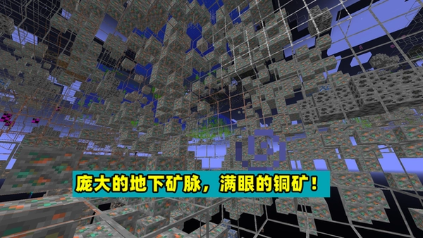 对于资深的“模组”玩家而言,“矿脉”这个词想必并不陌生,毕竟这类功能早就在模组里出现过了。这次原版新增的“矿脉”,会以“蛇状”的形态在地底分布:在Y坐标大于0的高度区域,铜矿矿脉会和花岗岩一同生成;而当Y坐标小于0时,铁矿矿脉则会伴随着凝灰岩出现。