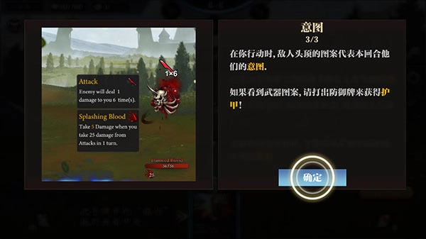 3、意图在你行动时,敌人头顶的图案代表本回合他们的意图。如果看到武器图案,请打出防御牌来获得护甲!