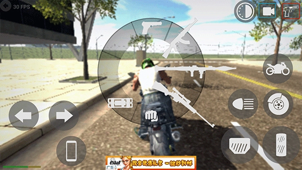 2、借助左侧的控制键操控角色移动至屋外,骑上摩托车后,通过点击右侧的油门键与刹车键来控制车辆行驶。