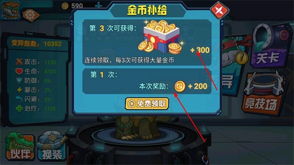 3、可免费领取金币奖励如本次奖励+200金币,连续领取每3次可获得大量金币,积累金币用于生物养成和伙伴解锁等操作。