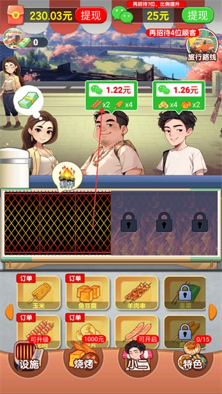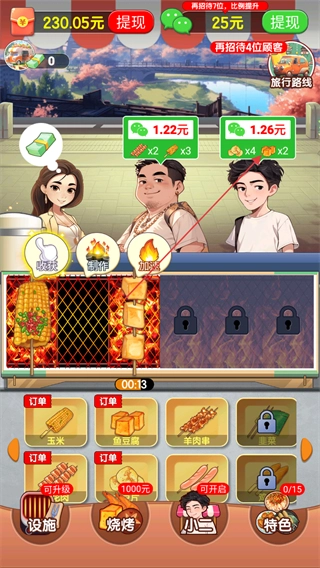1、打开游戏后,先看屏幕上方显示的现金数额是230.03元,接着去了解提现需要满足的条件,同时注意顾客消费金额的提示信息,比如1.22元这样的显示。