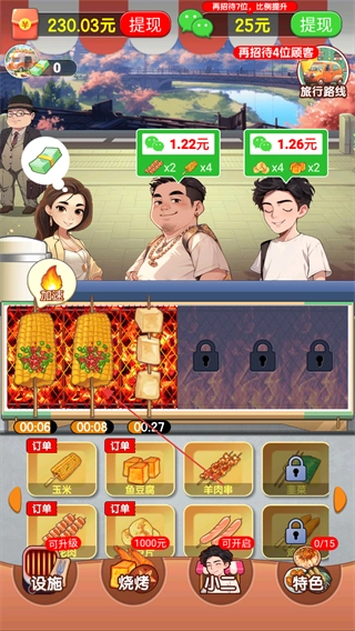 3、烤制完成后,点击烧烤上方的烧烤架按钮,将烤好的食物提供给顾客获取收入。
