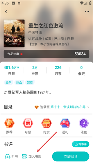 4、进入小说详情页面后,找到并点击【加入书架】按钮,即可完成将该小说添加至书架的操作。