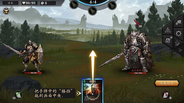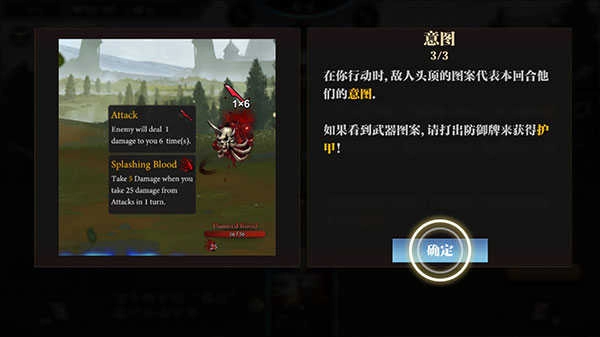 3、当你采取行动时,敌人头顶的图案显示着他们本回合的行动意图。要是看到武器图案,就打出防御牌来获取护甲。