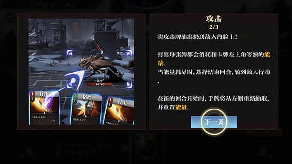 2、把攻击牌抽出来扔到敌人脸上!打出每张牌都要消耗和卡牌左上角数值相等的能量。等能量用完了,就选择结束回合,接下来轮到敌人行动。到了新回合开始的时候,手牌会从左边重新抽取,能量也会重置。