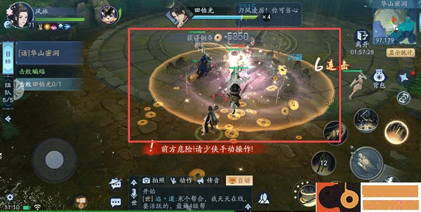 把这些蝙蝠清理干净后,就能遭遇最终BOSS田伯光了。田伯光的技能里,除了普通攻击,核心有三类:刀气凌厉、快刀和刀风。其中刀气凌厉针对的是他脚下的圆形区域,近战角色得及时拉开距离规避,远程职业则不用在意这个技能,能继续进行输出。