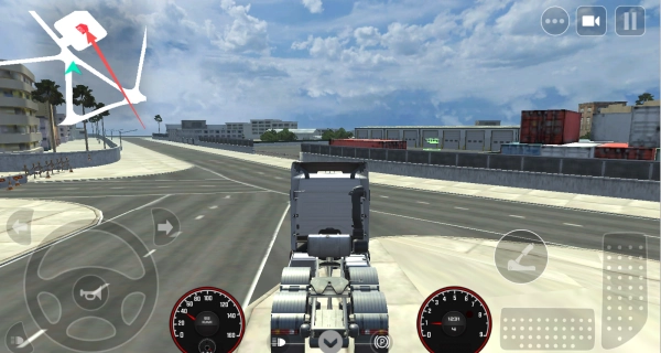 1、驾驶过程中,留意左上角的地图,牢记红色箭头所指示的目的地,借助虚拟方向盘和油门来操控车辆的行驶方向与速度,沿着规划路线准确到达任务地点。