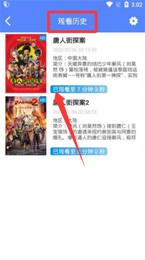 2、在观看历史栏目中,可查找未看完的视频并点击进入。