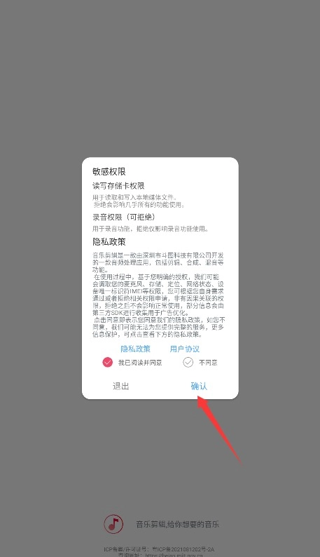 1、初次使用需阅读并勾选平台服务条款与隐私政策,确认后点击确认按钮进入应用。