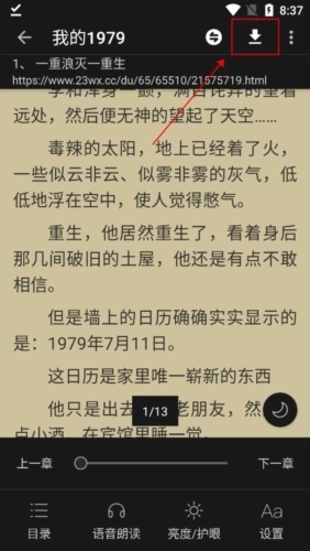 2、接着会进入阅读界面,要是想缓存内容,就能看到右上角【】的按钮,点击该按钮即可。