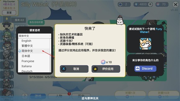 Silly Wisher是B站UP主【sketchi】独立制作的原神模拟抽卡小游戏,它的中文名是“不是元神”。这款游戏收录了原神开服至今所有版本的卡池,每个版本卡池包含的角色各有不同,但抽卡时出卡、出金的概率都与原神官方设定完全一致。依托真实概率机制,玩家可以在Silly Wisher最新版本中免费抽卡,不仅有无限原石可供使用,还能随意进行十连抽,借此测试自己是运气爆棚的欧皇,还是运气平平的非酋。