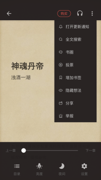 3、打开正在阅读的小说时,软件支持自由调整阅读亮度、文字大小、夜间模式等设置,还具备语音阅读功能,能让人沉浸式体验小说故事。