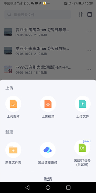 1、打开应用即可根据文件类型将文件上传到云盘中。