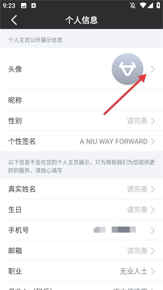 3、进入个人信息页面后,点击【头像】选项,即可进入头像修改页面。
