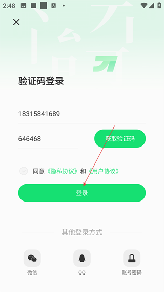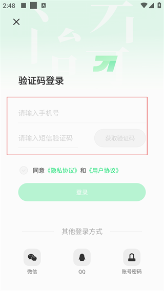 3、切换至验证码登录界面后,依次输入手机号码与短信验证码,并勾选同意《隐私协议》及《用户协议》,完成登录前的准备操作。