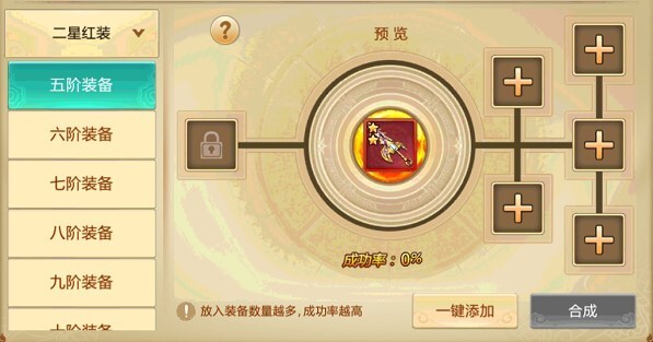 以5阶装备的合成为例,5阶红色2星装备的合成由3-5件5阶橙色2星的装备合成,其中3件合成成功率为70%,4件成功率为85%,5件成功率为100%