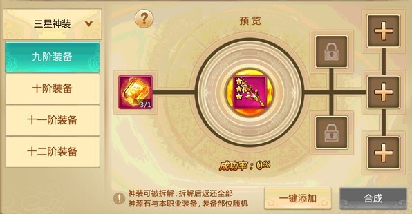 三星粉装的合成同样与之差别不大,神装由3件同职业红色三星装备加上一颗神源石来合成,合成成功率为100%