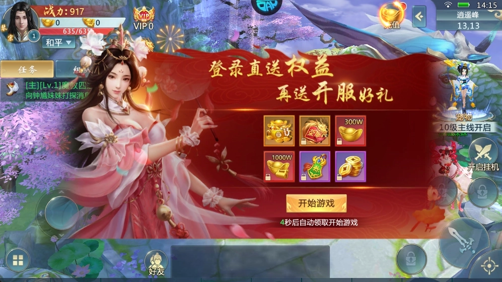 1、进入游戏完成职业选择后,就能直接领取丰厚的登录福利,其中包含大量元宝和实用道具,助力你迅速踏入修仙世界,轻松开启修仙之旅。
