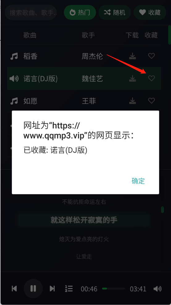 4、点击歌曲后面的收藏按钮可以收藏音乐。