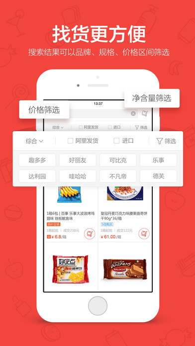 2、全新改版的首页新增了“城市速配”“粮油副食”“休闲食品”“日化纸品”“饮料啤酒”以及“会员中心”六大功能入口,让补货操作更加便捷;